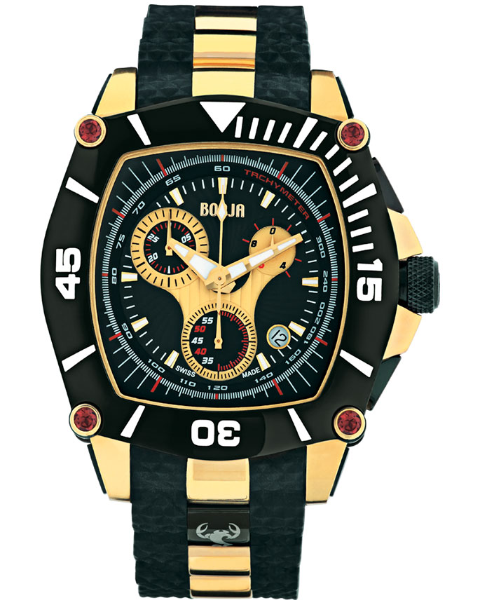 Scorpio presents a new dynamic look giving it a unisex touch. This 45 mm large SWISS MADE chronograph watch is made with 316L stainless steel, the bezel is crafted with perfect roundness, set with 4 round brilliant cut best quality natural garnet, 5 ATM, sapphire crystal. The rubber strap is specially made with 8 Stainless steel links.